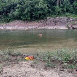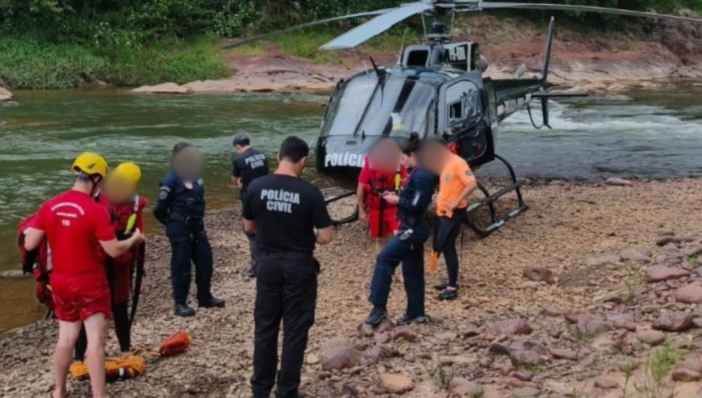 Para acessar o local inicial do afogamento, os socorristas precisaram caminhar cerca de 500 metros por área de mata. O trecho do rio apresenta largura considerável, rochas nas margens e vegetação densa no entorno.