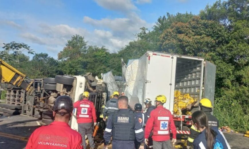 Segundo informações da Polícia Militar Rodoviária (PMRv), o acidente ocorreu por volta das 15h, no Km 33. A batida envolveu dois caminhões, sendo que um estava carregado com fardos de cerveja.