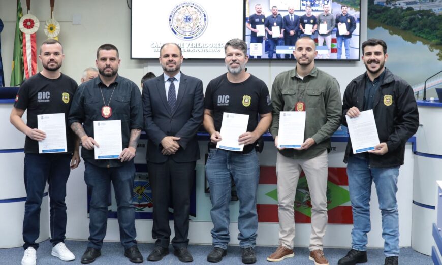 A Câmara de Vereadores de Tubarão acatando a proposição do vereador Felippe de Souza Tessmann, entregou a Moção de Cumprimentos nº 311/2025, aos profissionais da Delegacia de Investigação Criminal (DIC) de Tubarão, pelo trabalho de excelência prestado em prol da segurança pública. A atuação desse grupo resultou em conquistas expressivas para a segurança de Tubarão e de Santa Catarina.