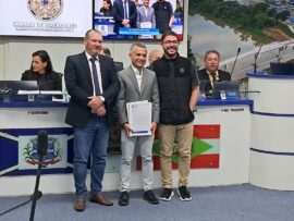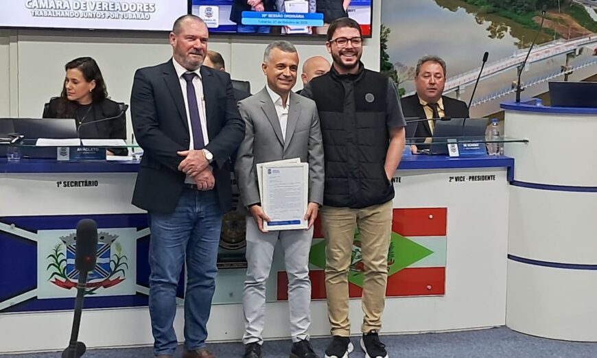 A Câmara de Vereadores de Tubarão acatando a proposição do vereador Gelson José Bento, entregou a Moção de Cumprimentos nº 257/2025, aos Representantes do Jornal Diário do Sul, Srs. Lúcio Flávio de Oliveira, Cristiano Carrador e Tomaz Albuquerque, que é um reconhecimento à realização do evento “Amigo da Educação”, ocorrido no dia 28 de agosto, no Espaço Versalhes, em Tubarão. A iniciativa integrou o projeto “Jornal na Escola”, desenvolvido pelo Diário do Sul, que visa aproximar os estudantes do universo da leitura e da informação jornalística, promovendo o senso crítico, o debate consciente e o protagonismo estudantil.