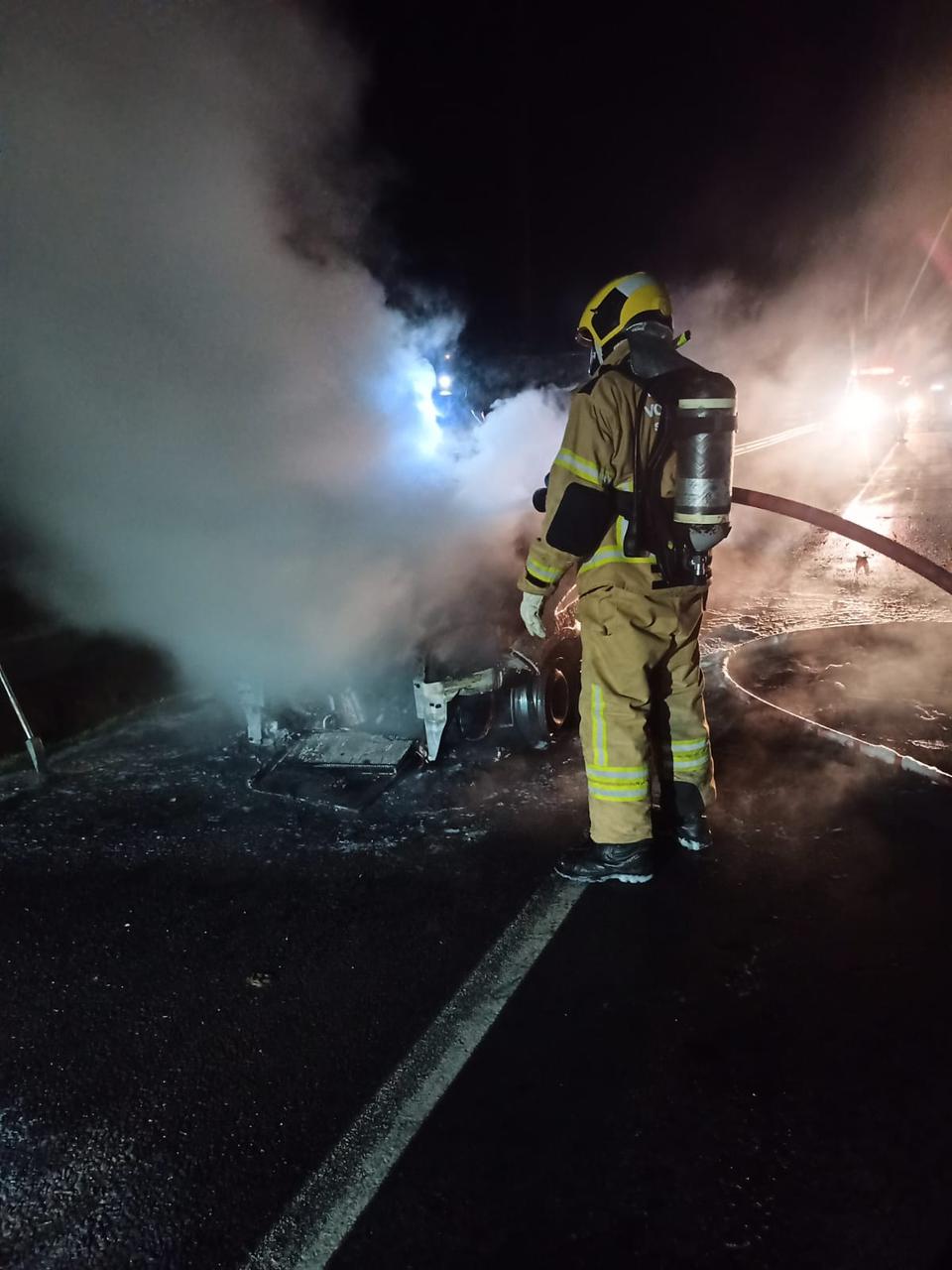 De acordo com o Corpo de Bombeiros, o veículo um Peugeot com placas do Rio Grande do Sul, já estava totalmente tomado pelas chamas quando a equipe chegou. Havia muita fumaça e vazamento de combustível no local.