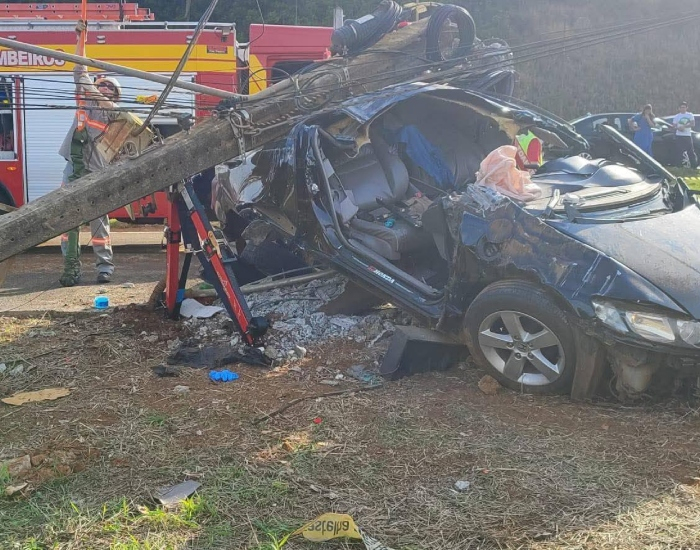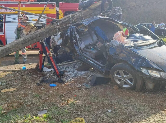 Um acidente de trânsito foi registrado, na marginal da BR-480, no bairro Trevo, em Chapecó, neste sábado, dia 11. O condutor do veículo Honda Civic perdeu o controle da direção, saiu da pista e colidiu violentamente contra um poste de concreto, que caiu sobre o carro junto com a fiação elétrica. Chegou a partir ao meio e ficar pendurado em um poste às margens da rodovia.