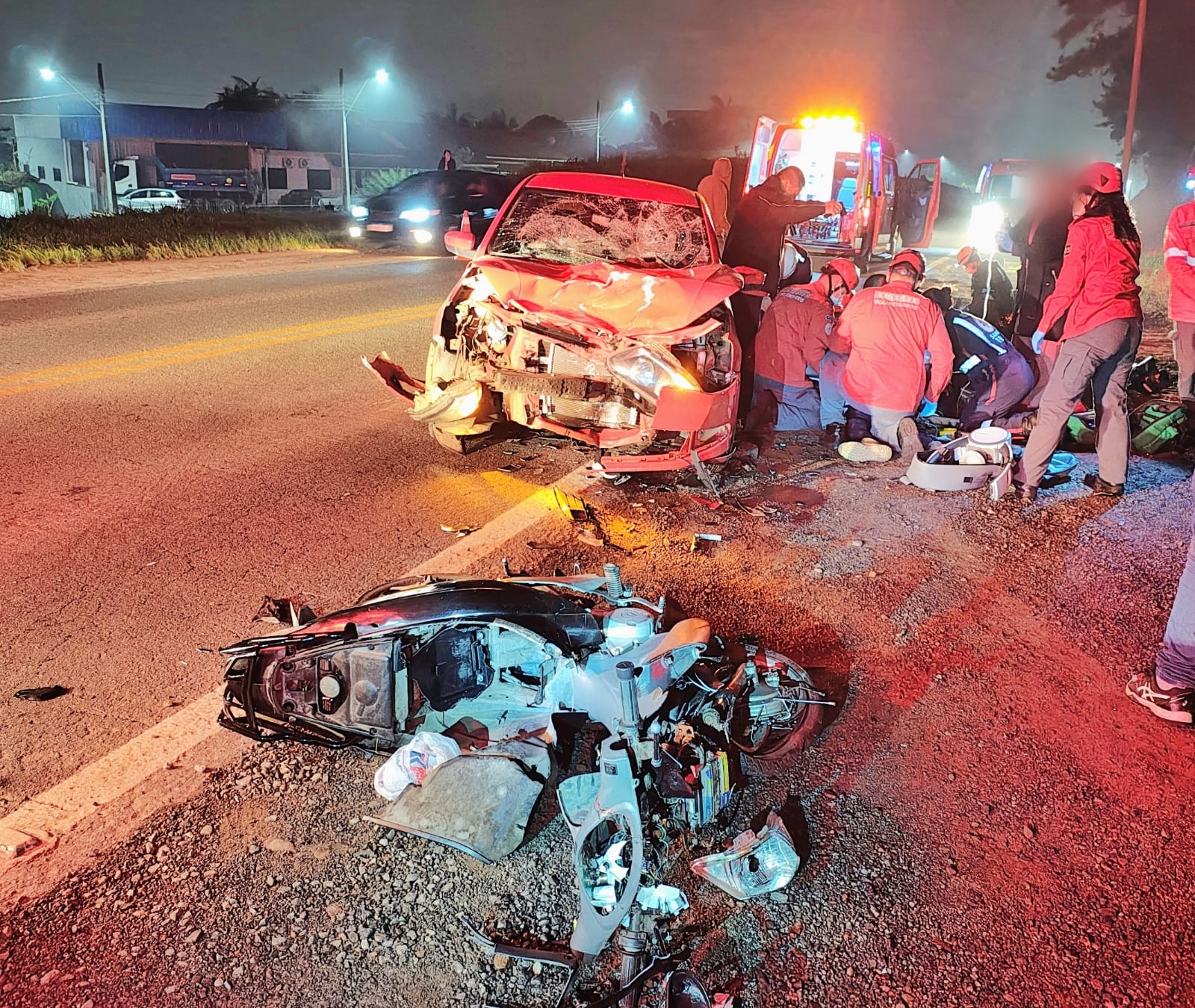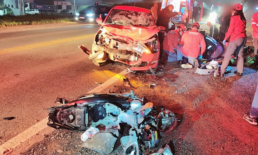 A colisão entre um carro e uma motocicleta foi registrado na BR-280 KM 74 no bairro Nereu Ramos em Jaraguá do Sul, na noite desta terça-feira, dia, 03. O Corpo de Bombeiros Voluntários foi acionado para atender a ocorrência por volta das 23h.