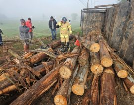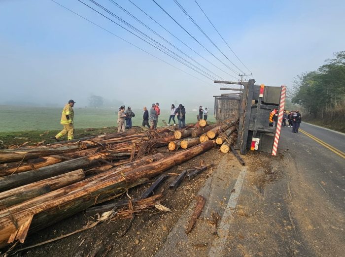 Um motociclista de 19 anos sofreu suspeita de fraturas e ferimentos após ser atingido por toras que caíram de um caminhão que tombou na SC-435, em Armazém. O acidente ocorreu na manhã desta quinta-feira, dia 11, no bairro São Francisco.