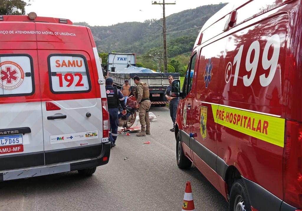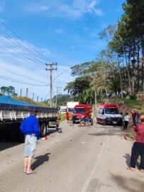 Uma colisão envolvendo uma motocicleta com placa de Treze de Maio e uma carreta de Araranguá, na Rodovia Ismael Damian Prevê, São Gabriel em Treze de Maio. O grave acidente foi registrado nesta quarta-feira, dia 8, por volta das 15h10.